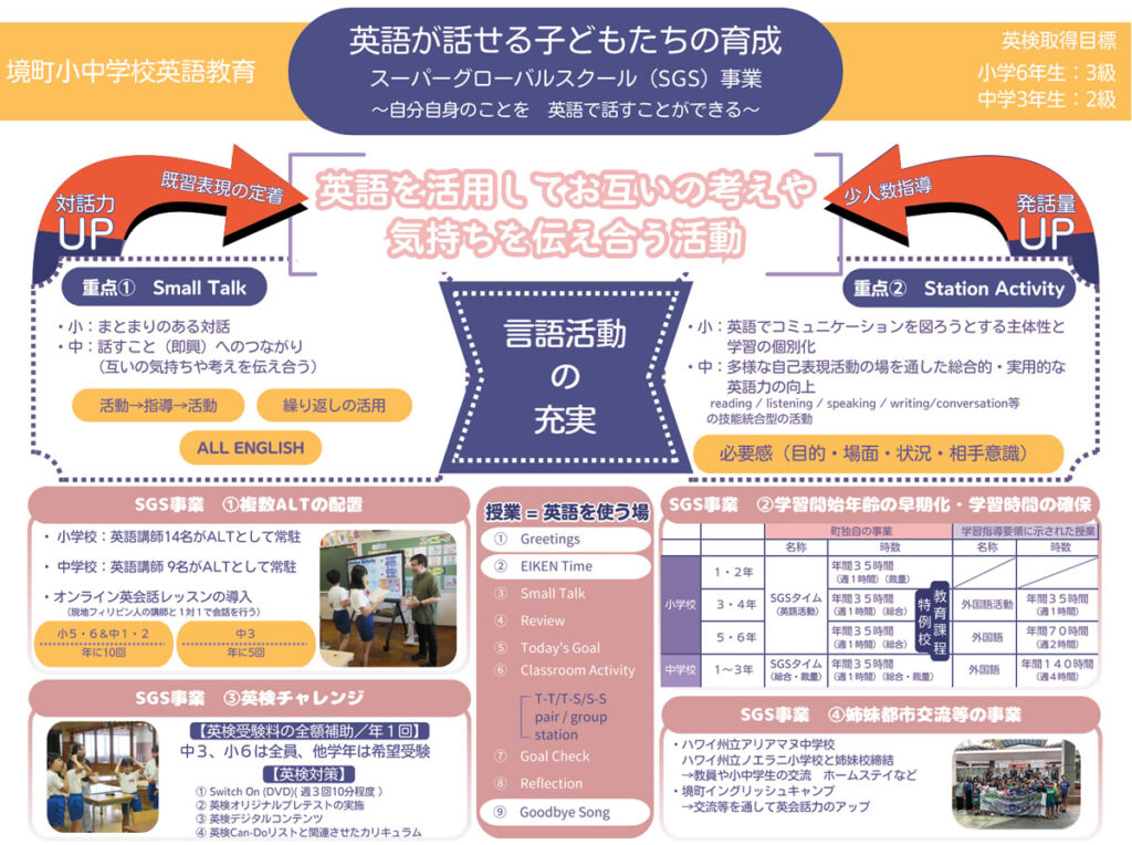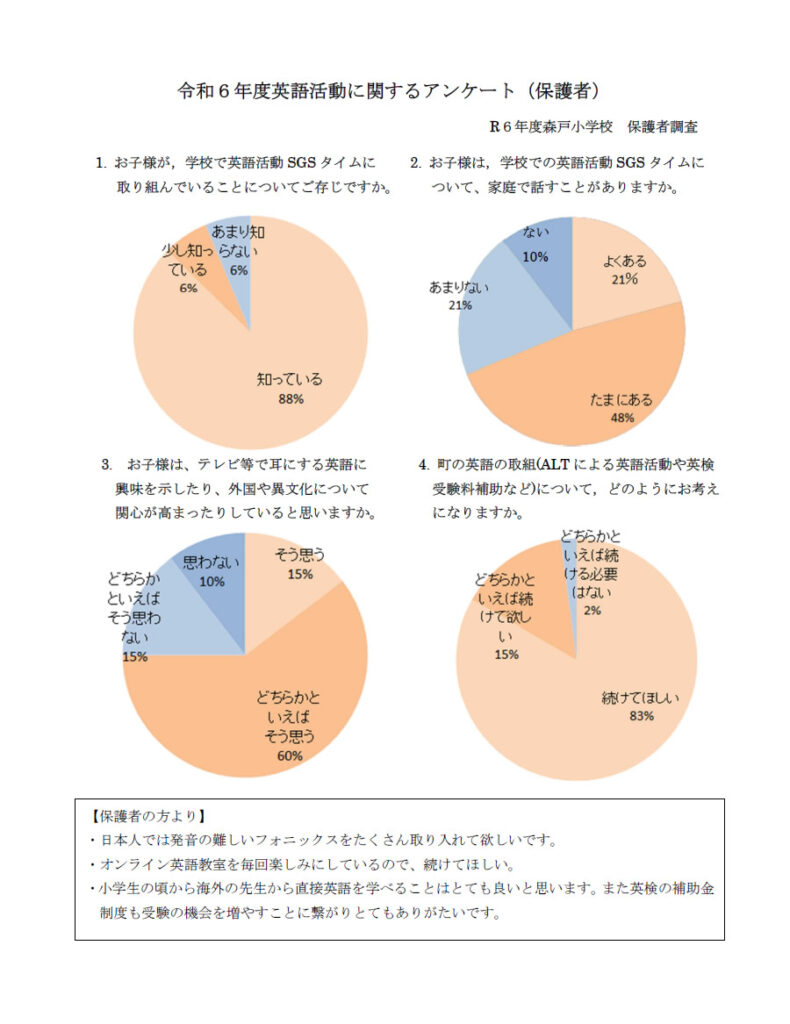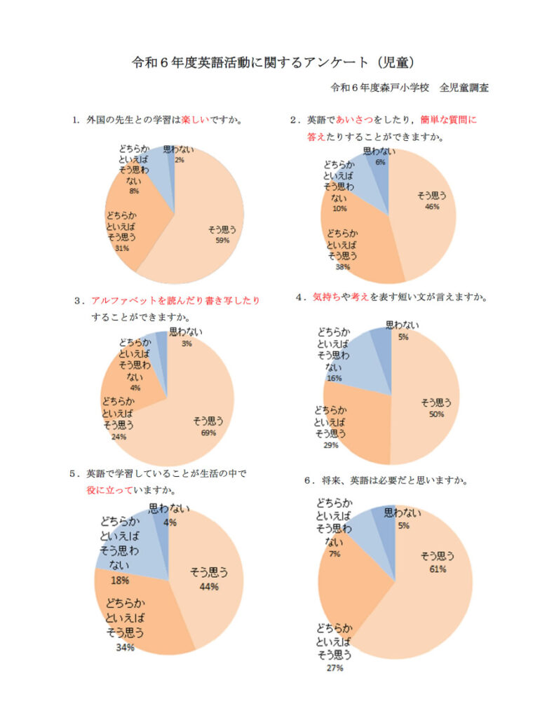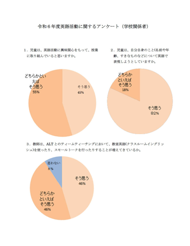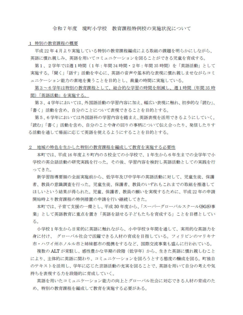 本校では、文部科学省の指定を受け、教育課程特例校として、特別の教育課程を実施しております。具体的には、3 年生から6 年生で、総合的な学習の時間を一部削減し、年間35時間を「英語活動」の時間に充て、児童のコミュニケーション能力の育成を図っているところです。また、裁量の時間として、1 年生では年間34 時間、2 年生では年間35 時間を「英語活動」と設定しております。この実践を通して、小学校1 年生から英語に慣れ親しみ、学ぶ機会を創出しています。このたび、令和6年度の実践につきまして取組の評価を行いましたので、以下のとおり公表いたします。